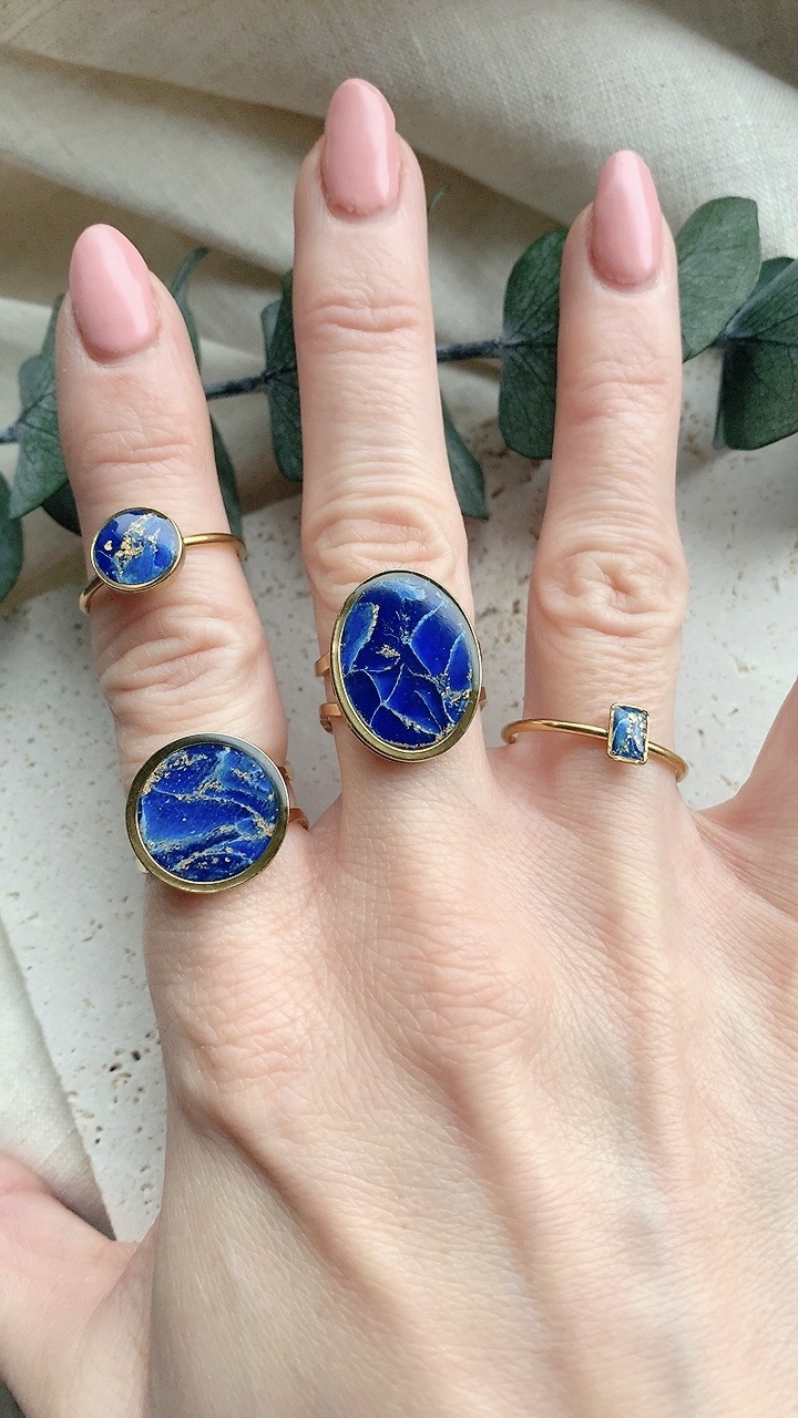 These rings are carefully handcrafted using polymer clay. Lapis Lazuli Inspired. Embedded on an adjustable ring stainless steel – so won’t turn your finger green and tarnish resistant! Very lightweight and comfortable to wear.