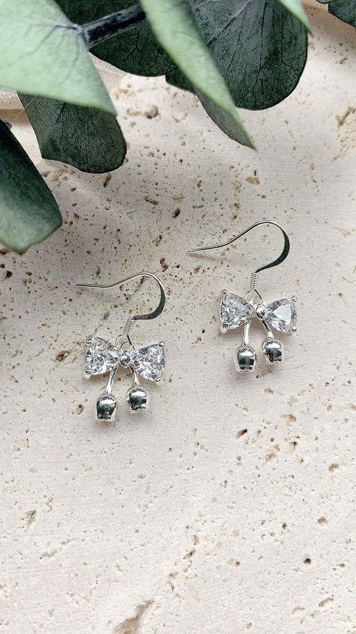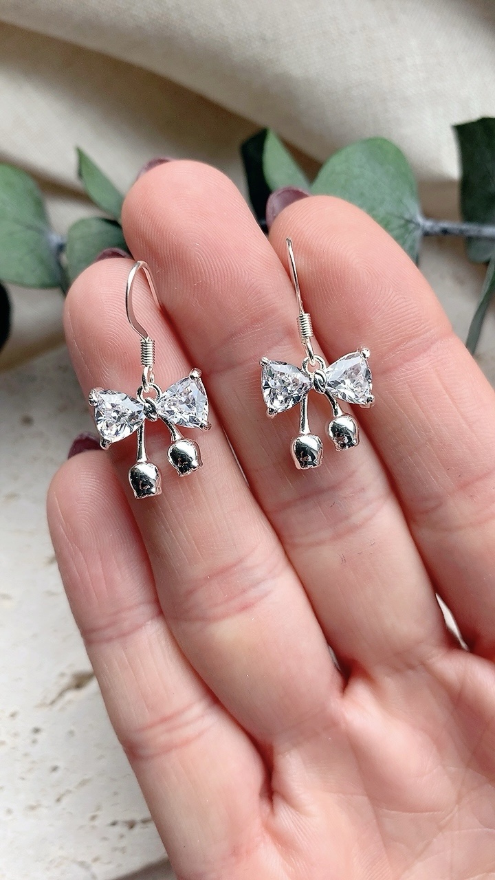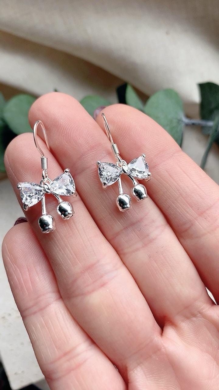 Beautiful silver butterfly charm earrings with 925 silver plated stainless steel hooks, hypoallergenic and suitable for sensitive ears. Bow charm is 925 silver plated cubic zirconia.