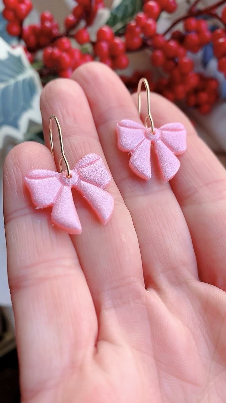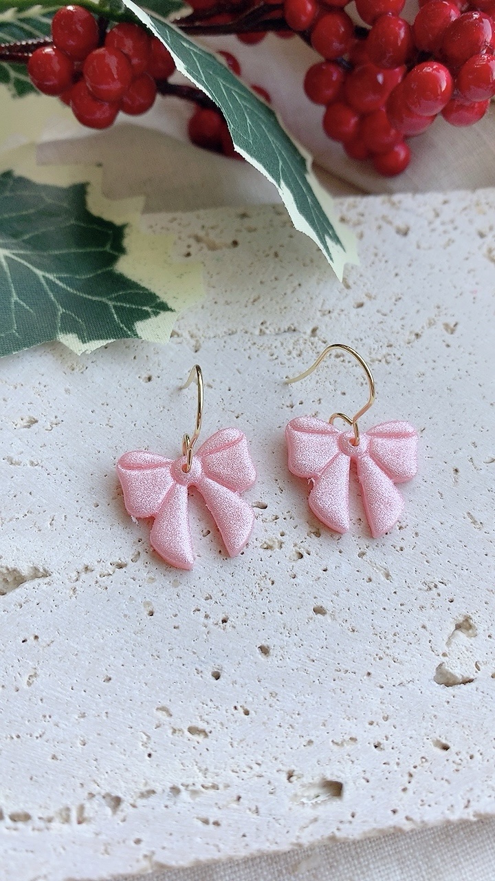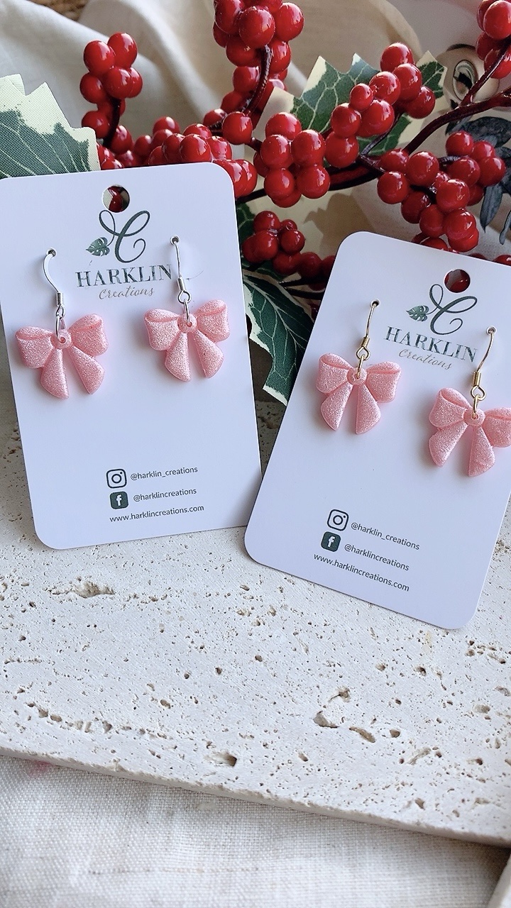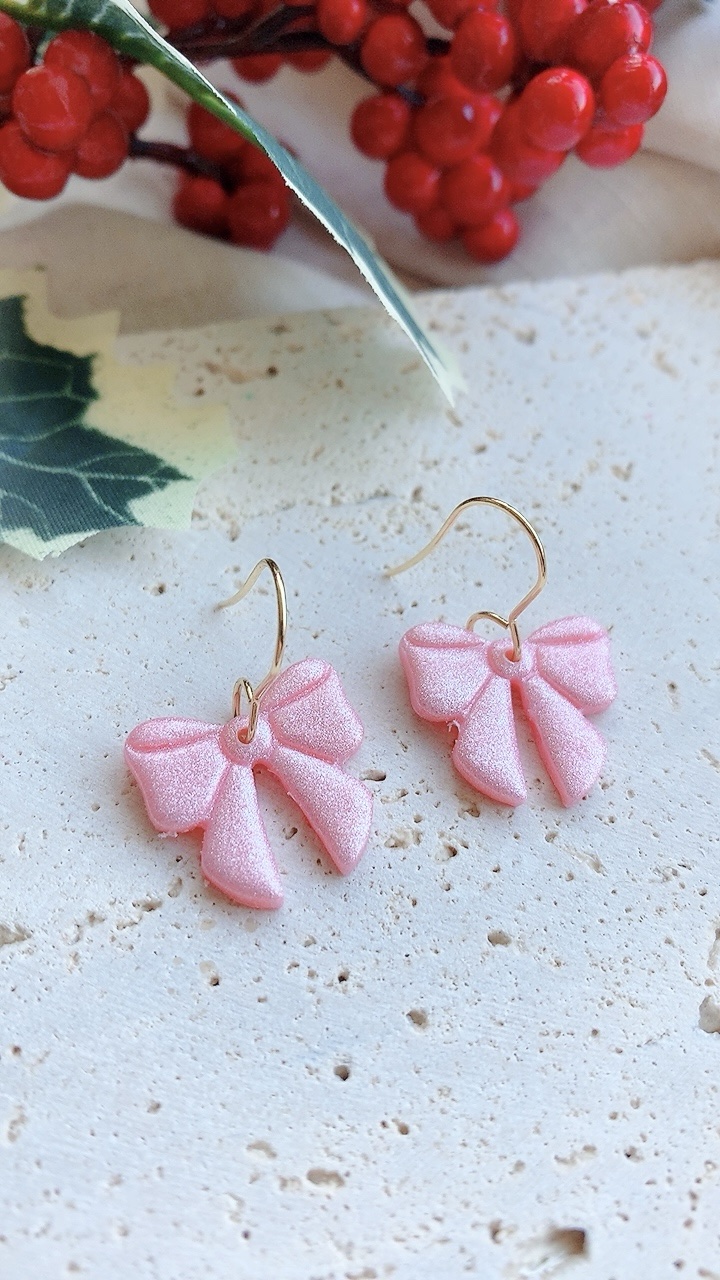 Shimmery pink bow earrings perfect for the Christmas season! All earring findings are hypoallergenic and suitable for sensitive ears. Available in other colours!