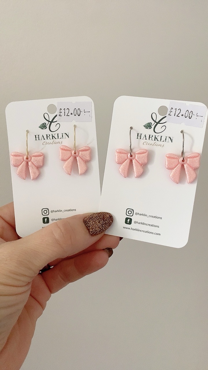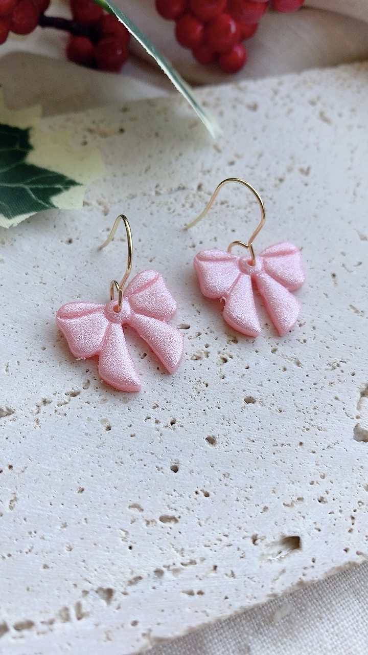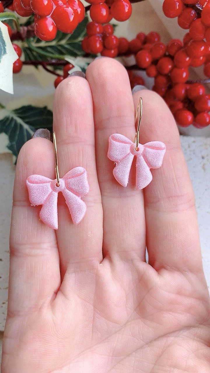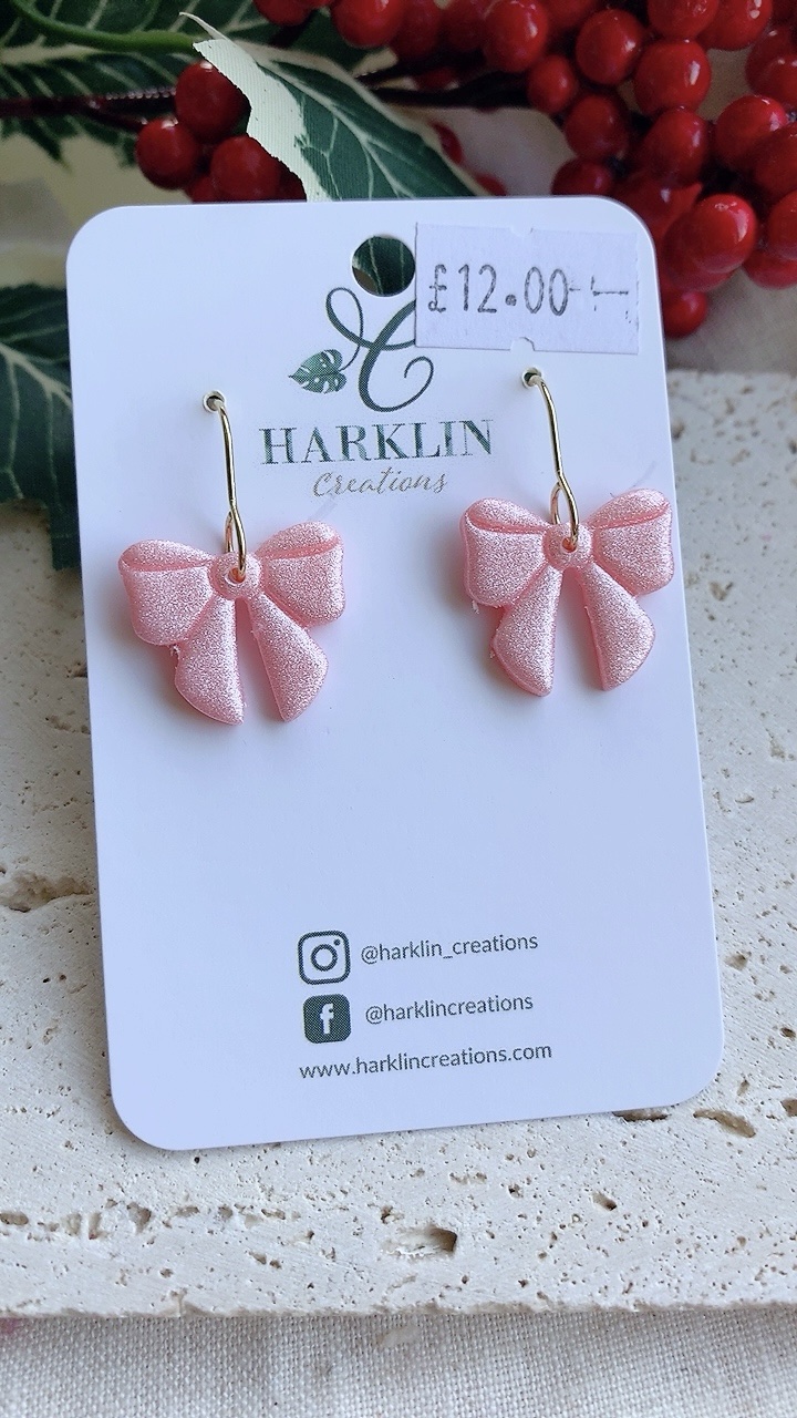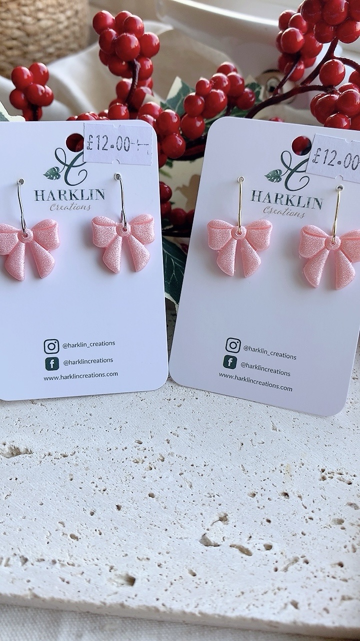 Shimmery pink bow earrings perfect for the Christmas season! All earring findings are hypoallergenic and suitable for sensitive ears. Available in other colours!