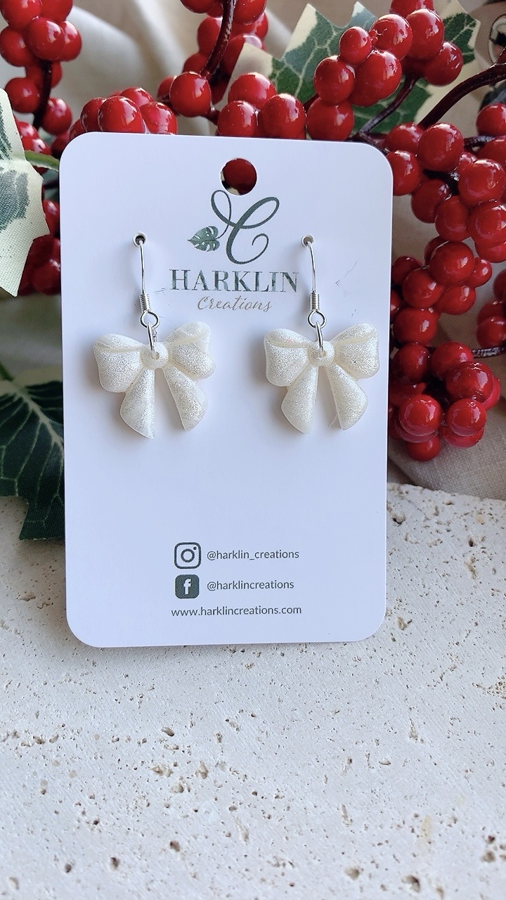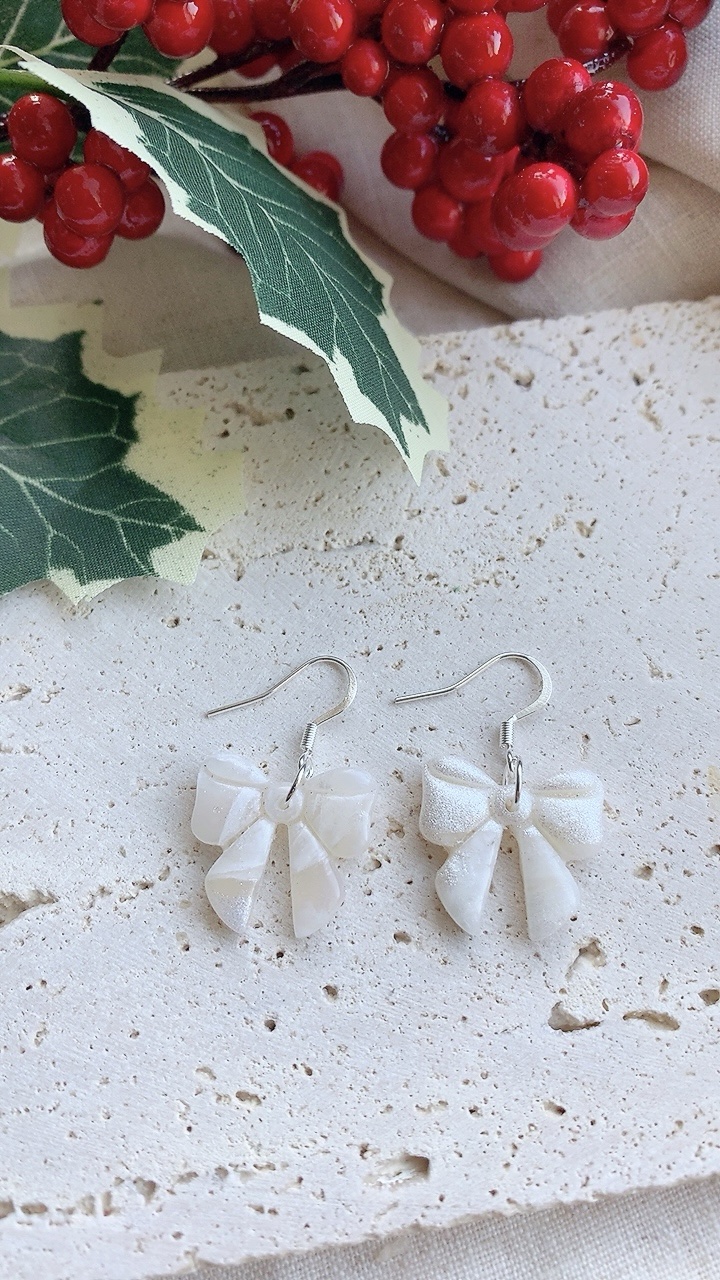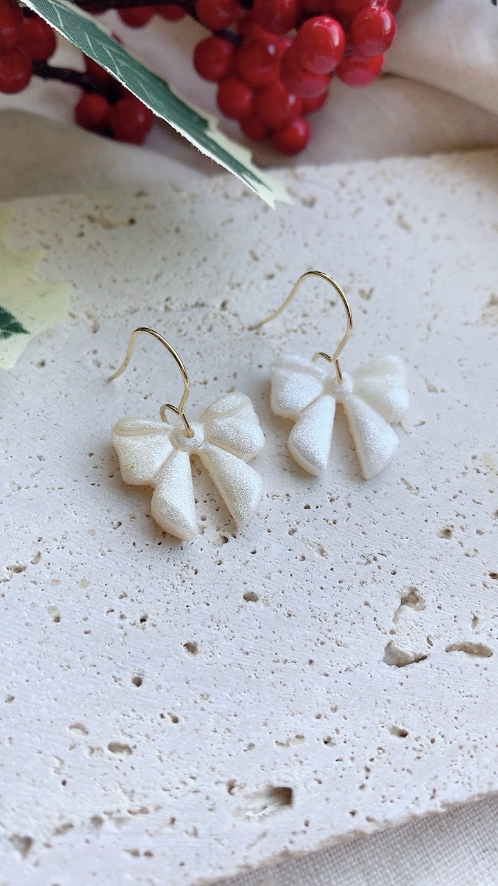 Shimmery white bow earrings perfect for the Christmas season! All earring findings are hypoallergenic and suitable for sensitive ears. Available in other colours!