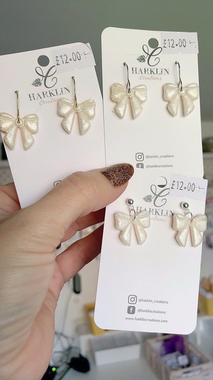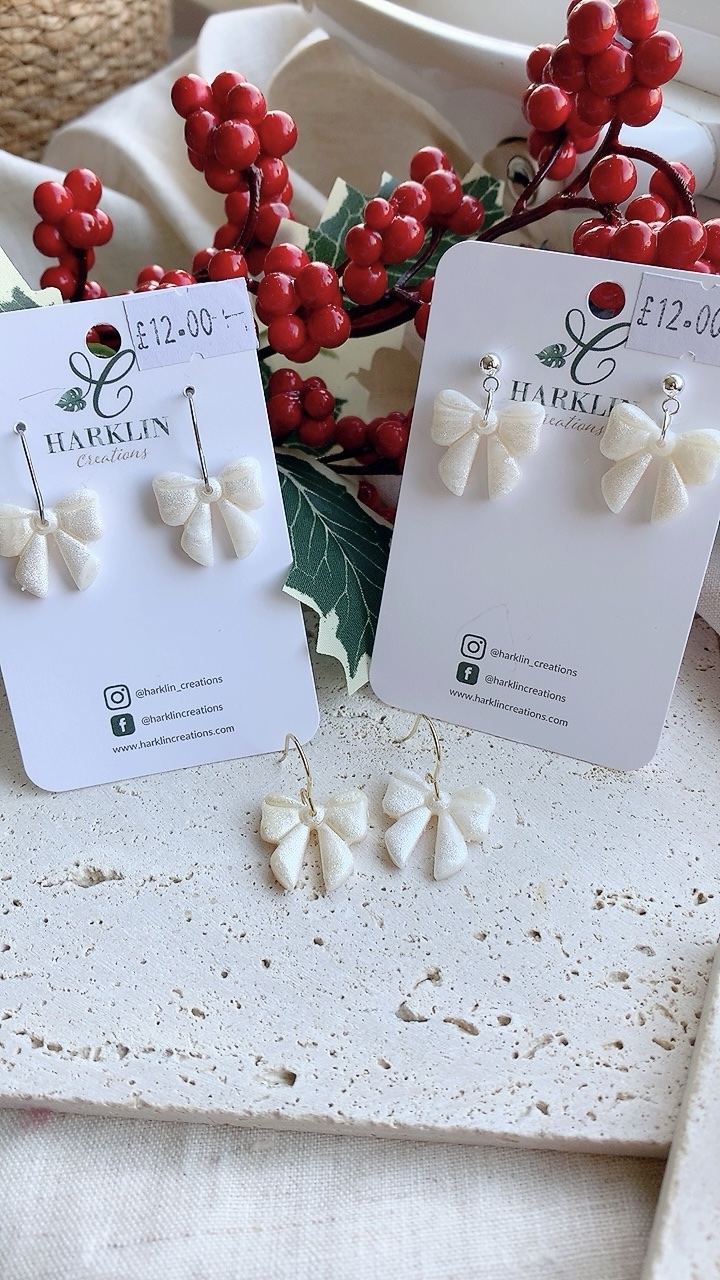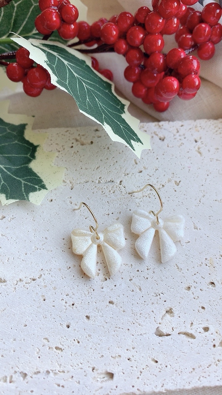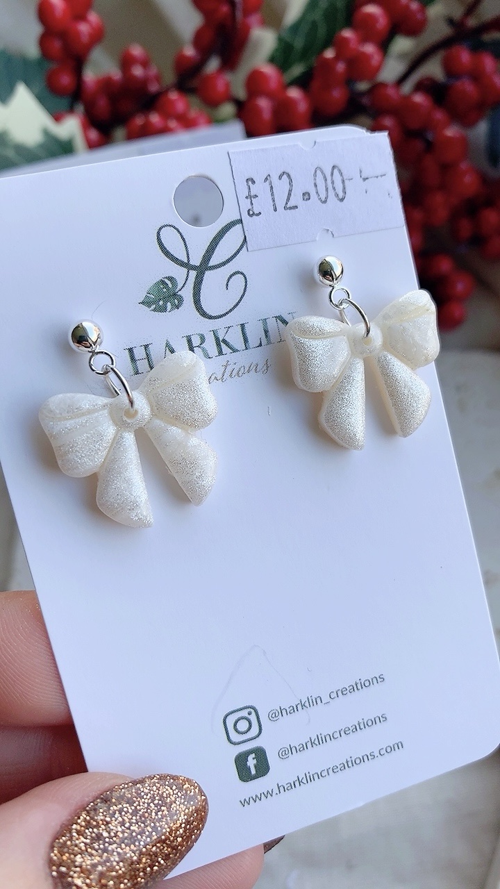 Shimmery white bow earrings perfect for the Christmas season! All earring findings are hypoallergenic and suitable for sensitive ears. Available in other colours!