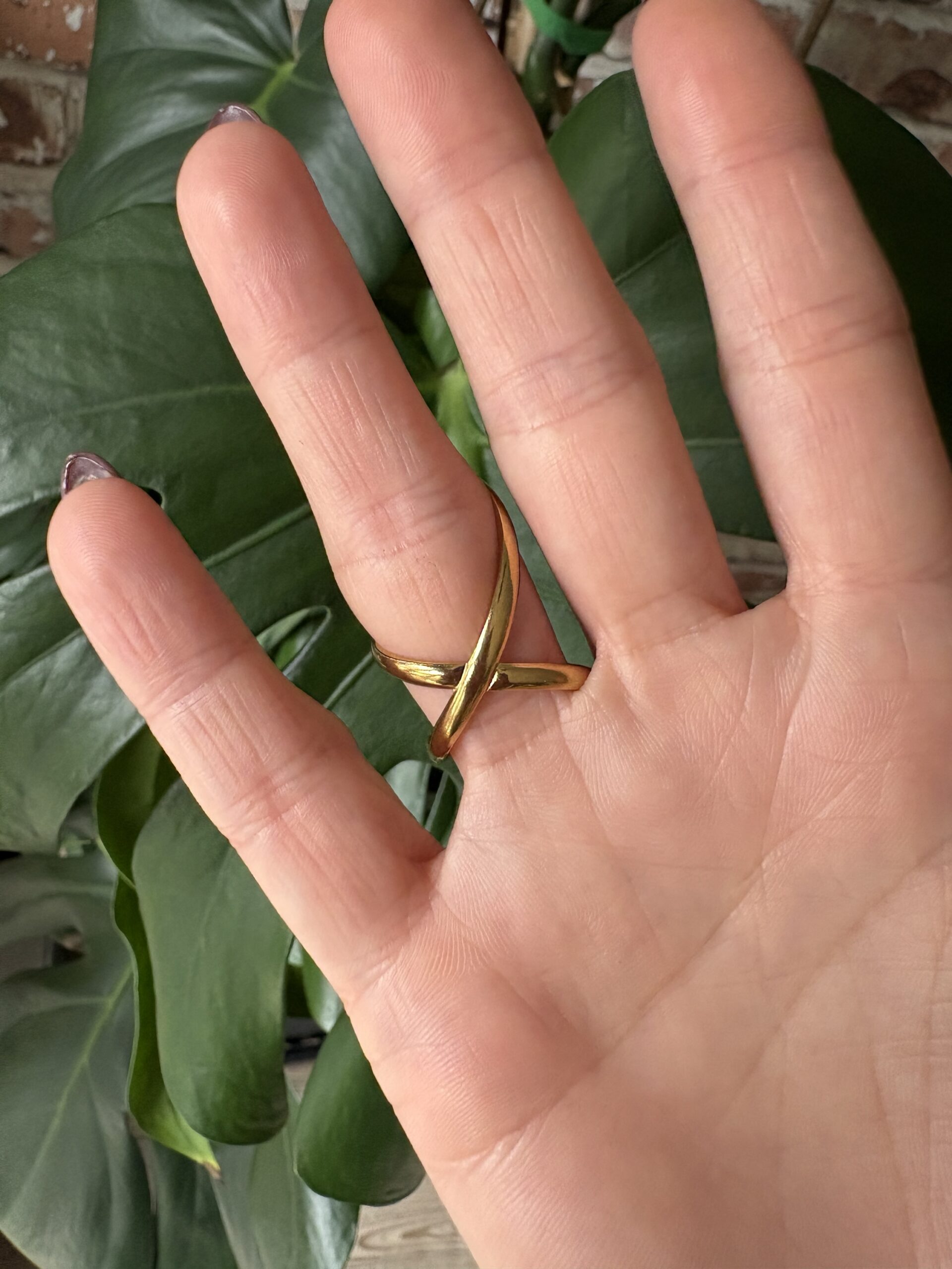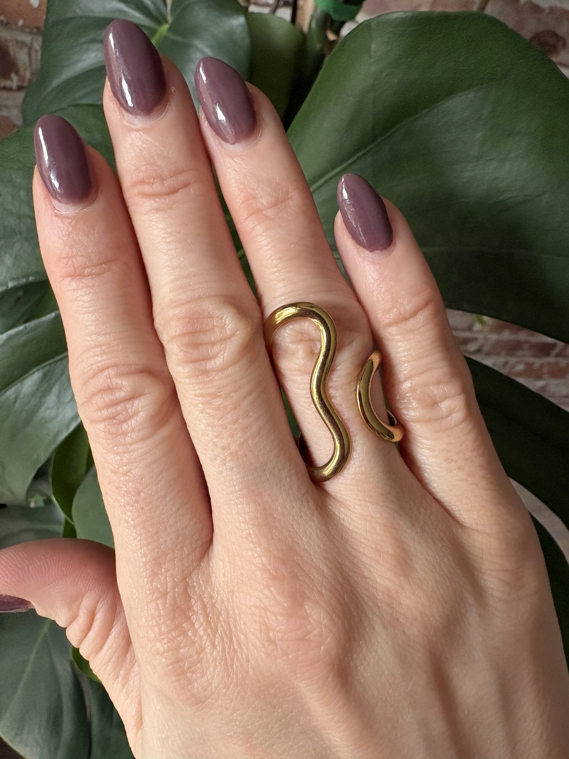 This ring is adjustable stainless steel – so won’t turn your finger green and tarnish resistant! Very lightweight and comfortable to wear.