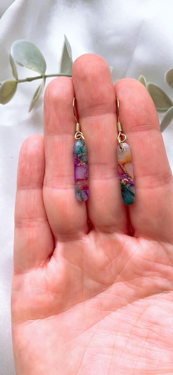 Gorgeous shiny purple, green, ginger and gold coloured dainty dangle earrings. Created using alcohol inks, translucent clay and gold leaf.