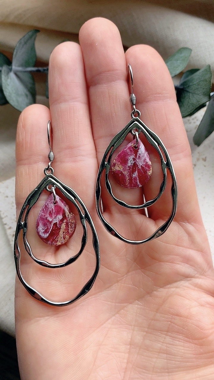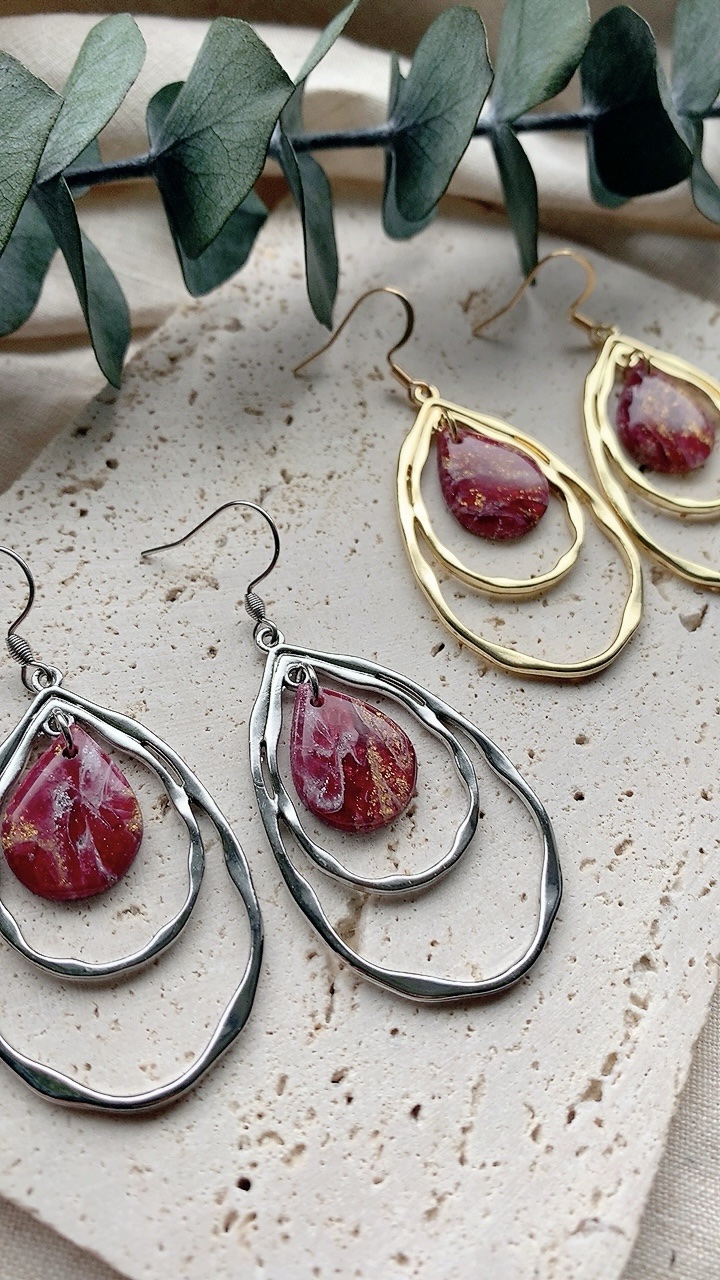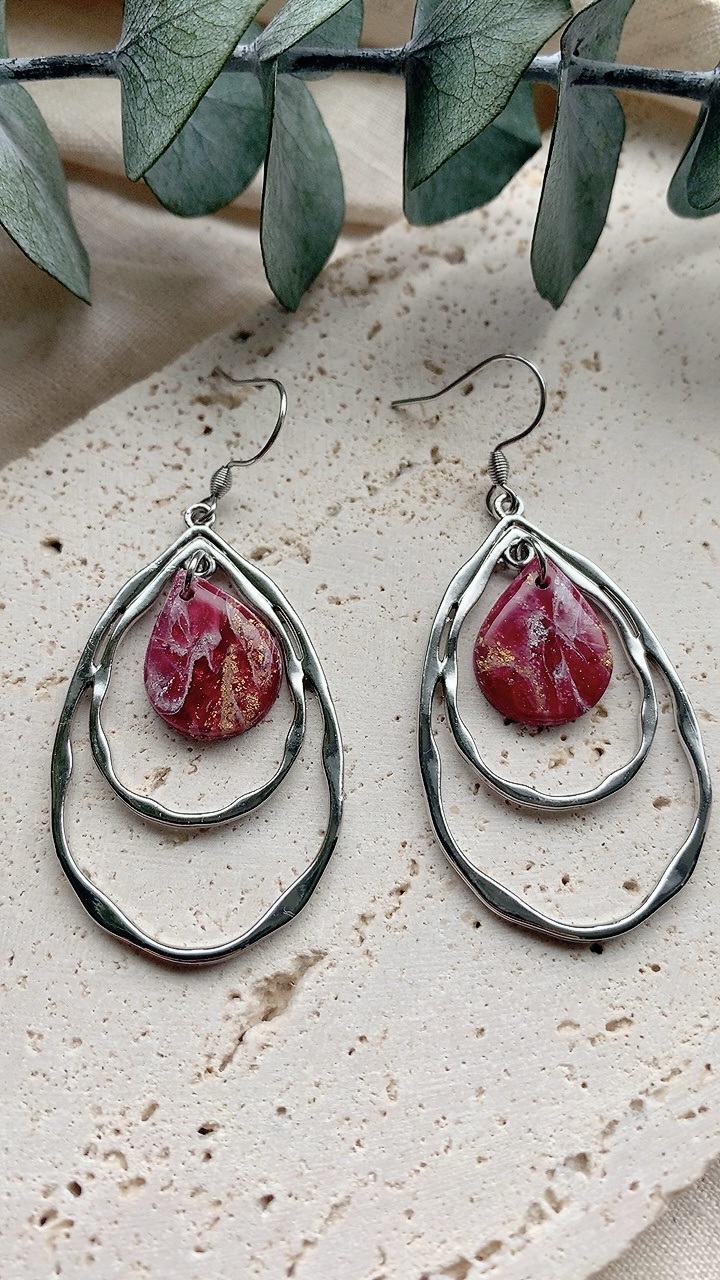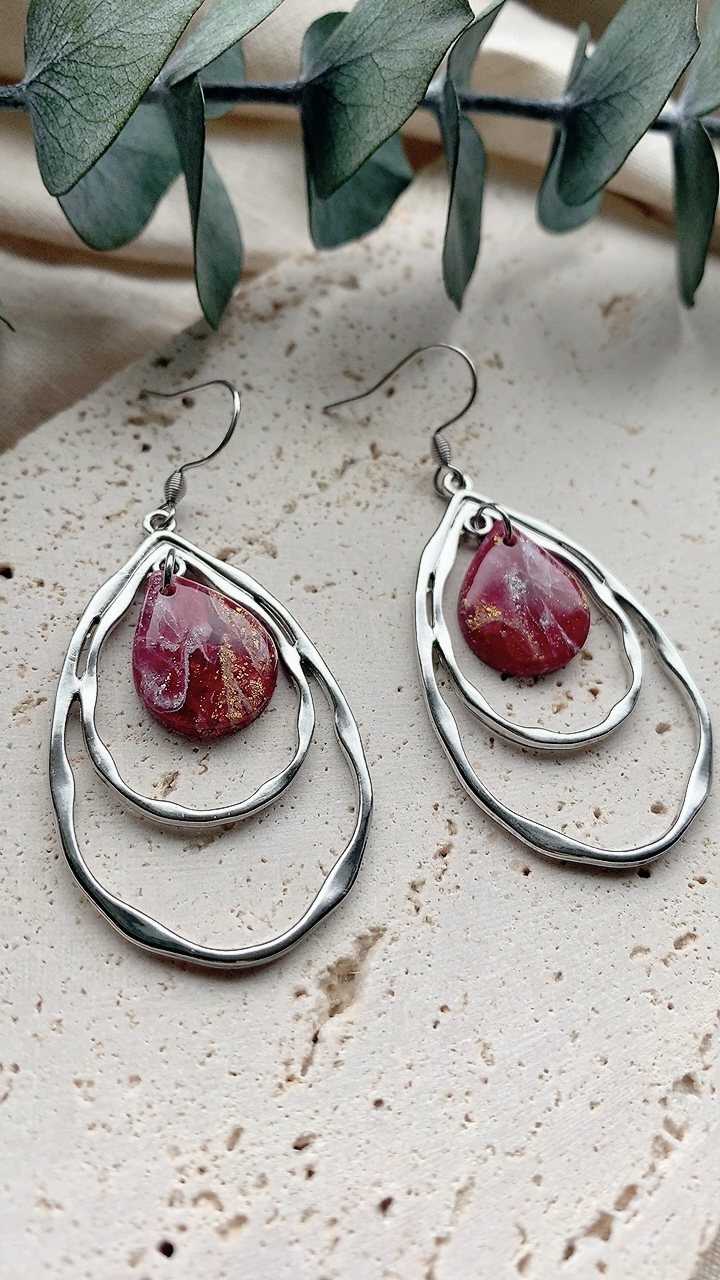 These earrings are carefully handcrafted using polymer clay and silver leaf finished with an attractive teadrop shaped charm. Very lightweight and comfortable to wear.  Choose from stainless steel hooks/ballposts. Also available in gold!