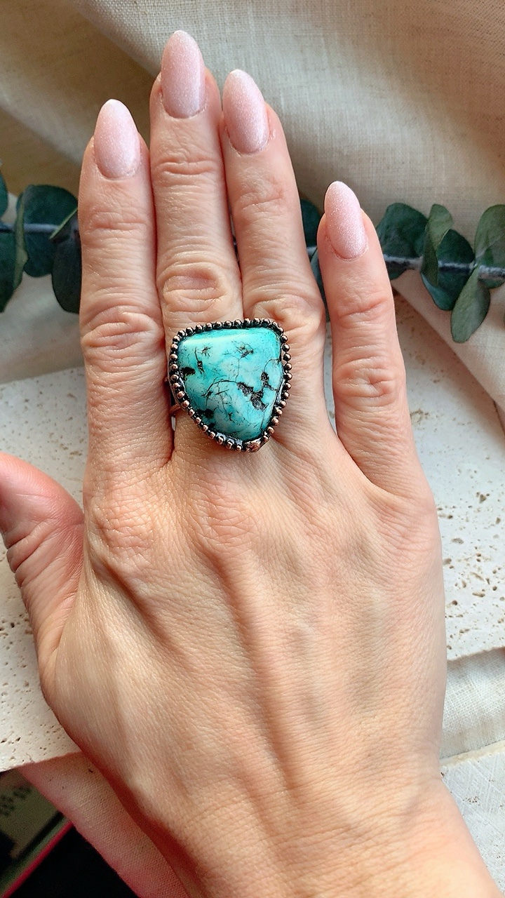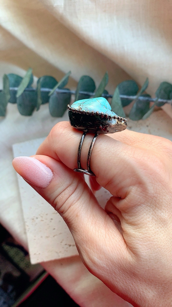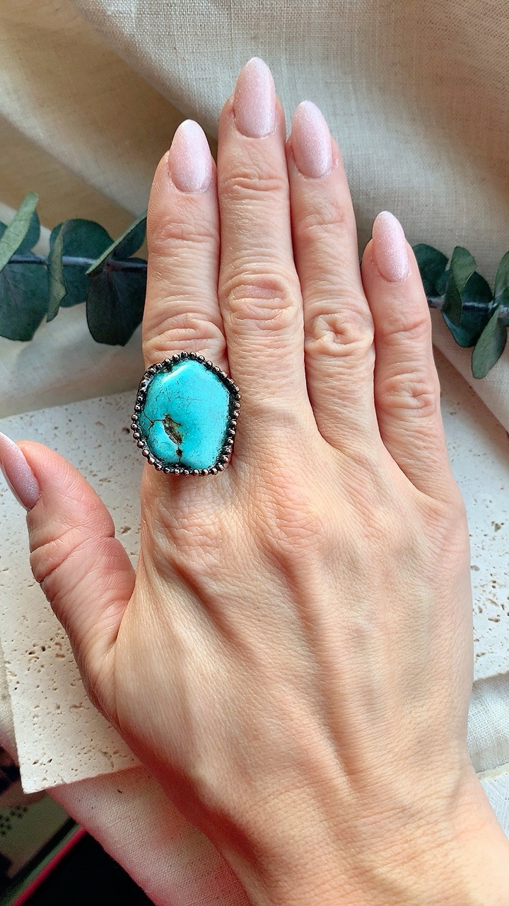 This ring is adjustable with brass findings, cadmium and lead free.  Size about 17.5mm inner diameter, 7-11mm wide. Very lightweight and comfortable to wear.