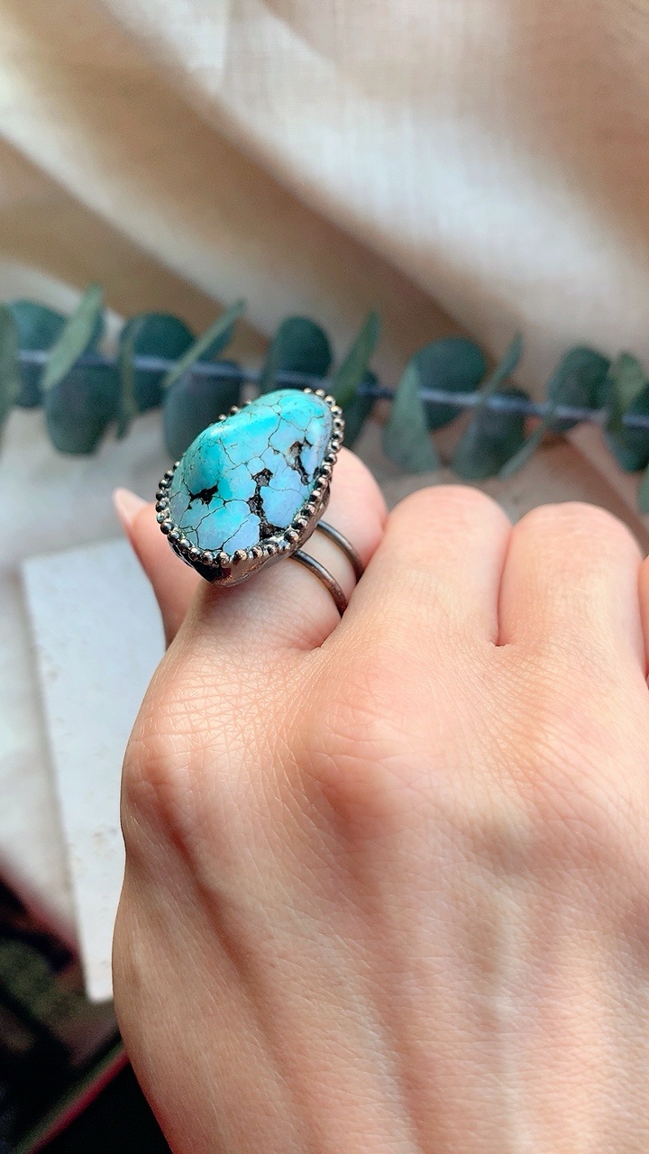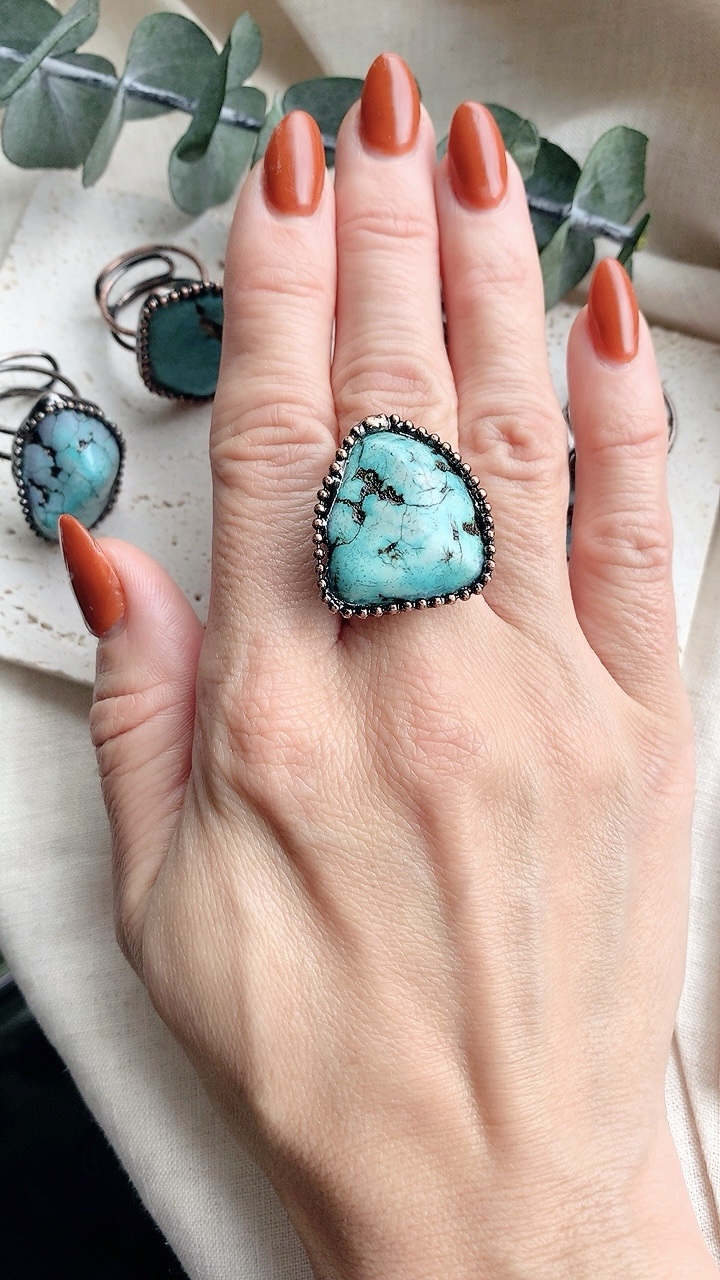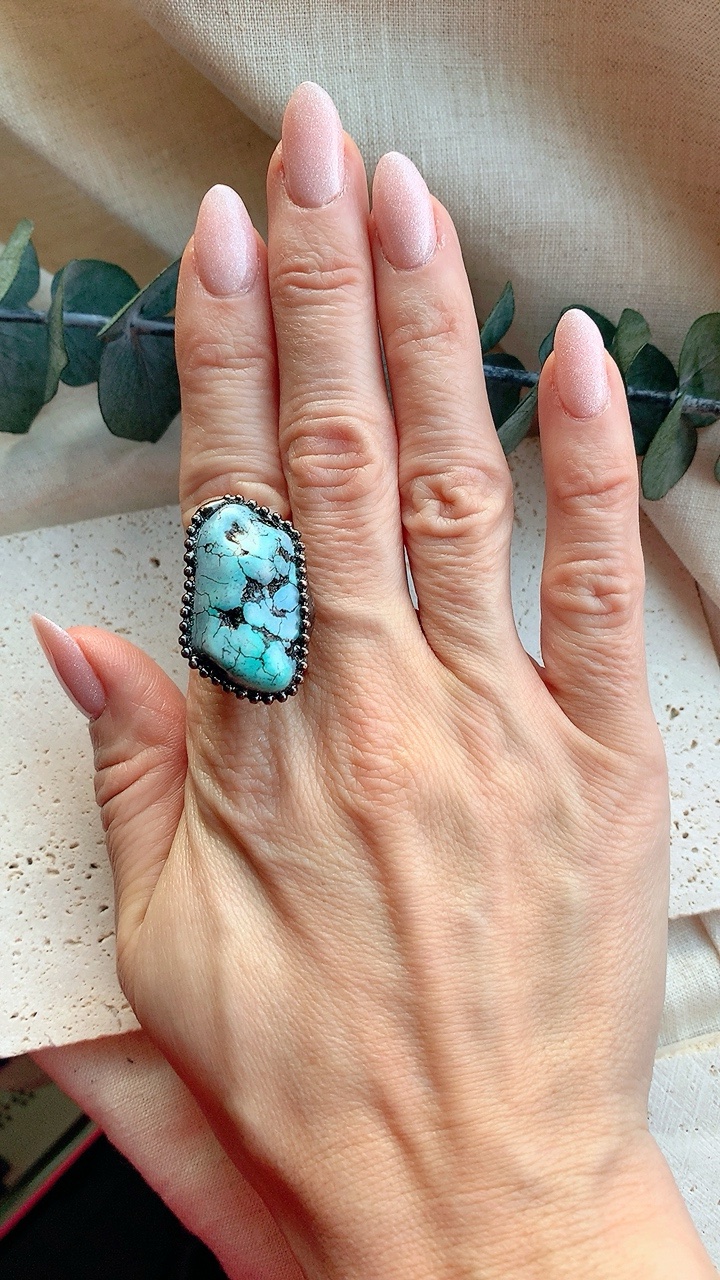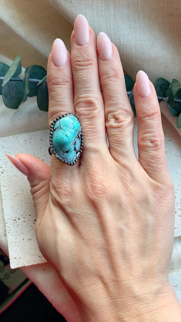 This ring is adjustable with brass findings, cadmium and lead free.  Size about 17.5mm inner diameter, 7-11mm wide. Very lightweight and comfortable to wear.