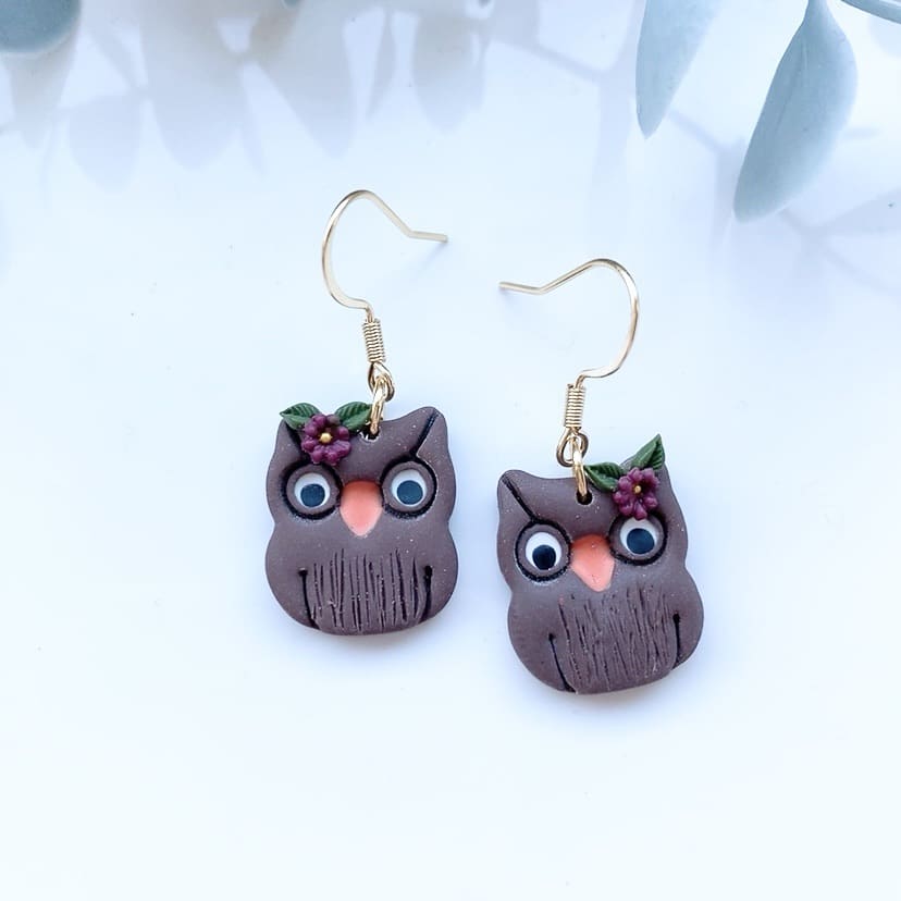 Meet Oola! Shes a super cute pair of handcrafted owl dangle earrings, perfect style suitable for any time of year! Brown clay, textured by hand and decorated with clay leaves and flowers. Then finally hand painted with white and black liquid clay to give the owl her gorgeous features!