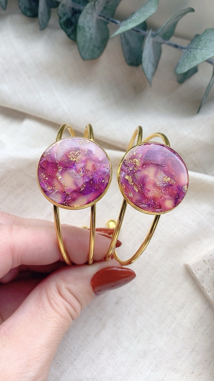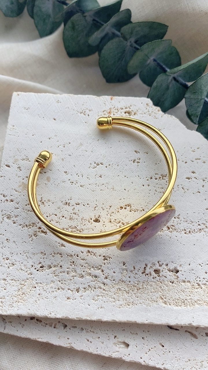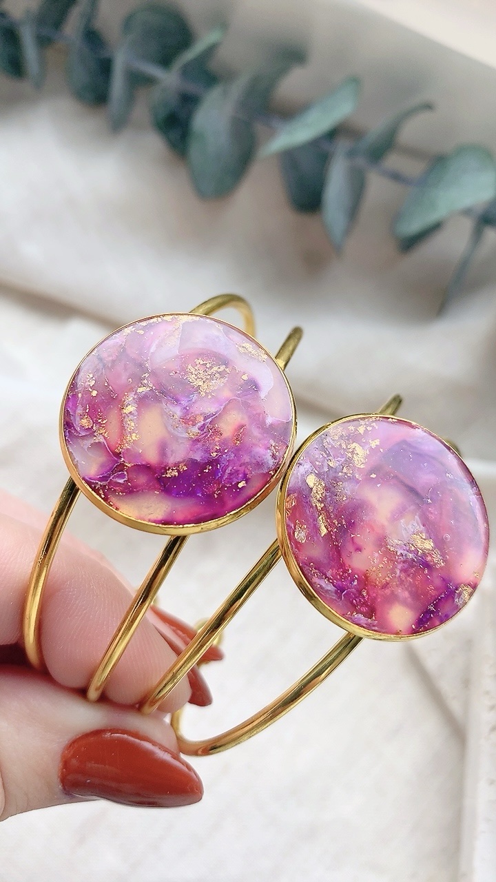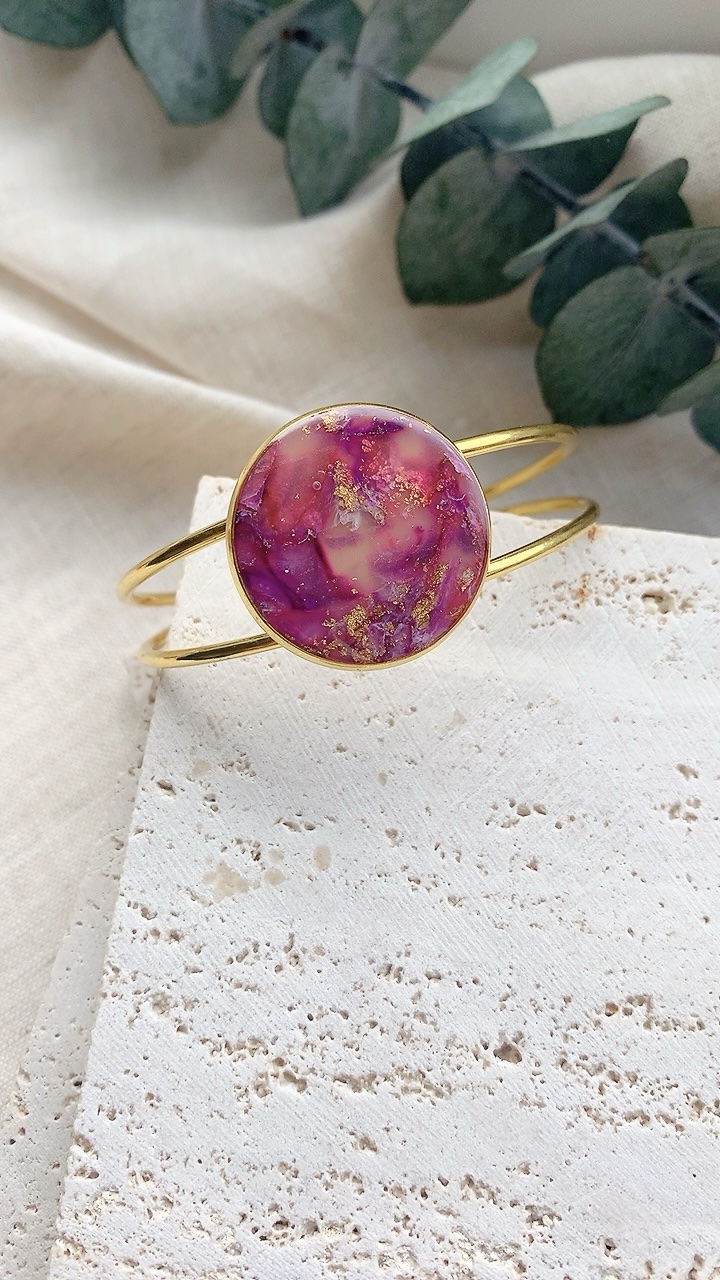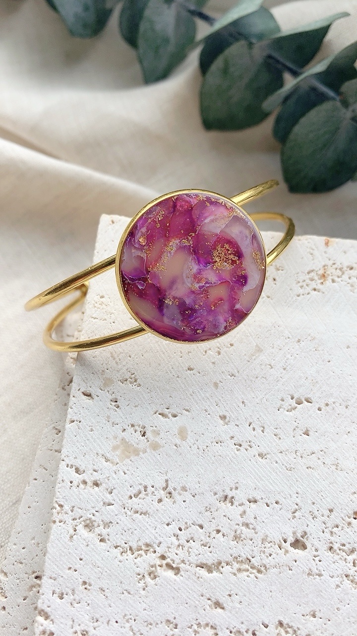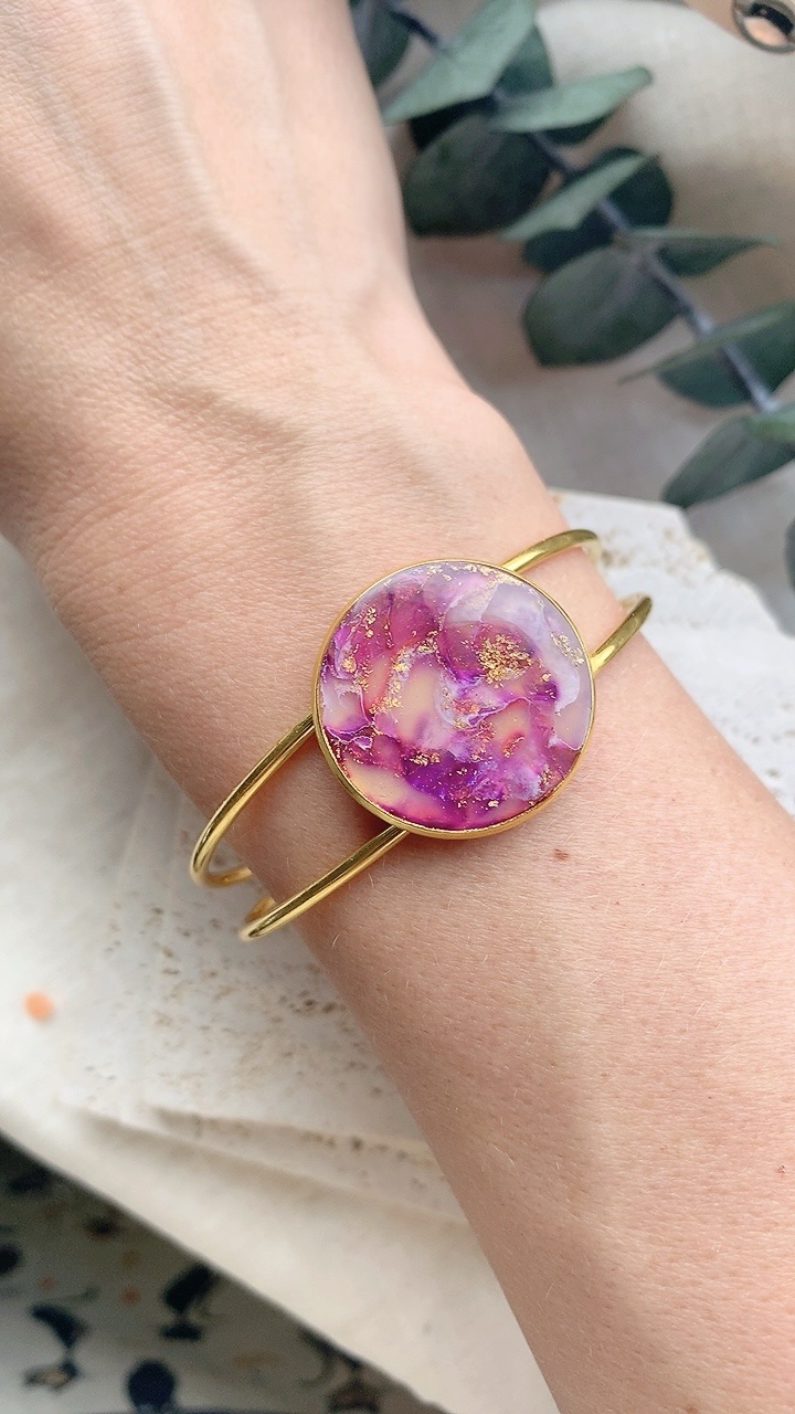 This bangle is carefully handcrafted using polymer clay, acrylic paint and gold leaf. Embedded on an adjustable bangle. Very lightweight and comfortable to wear. 25mm circle.