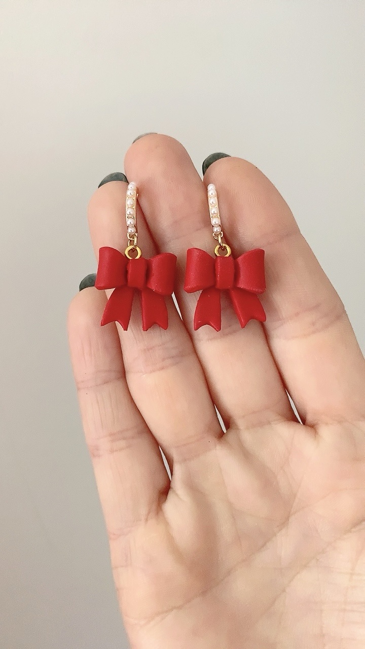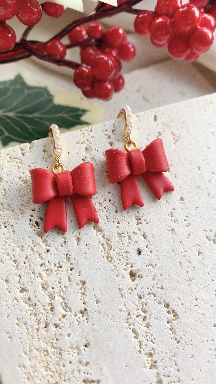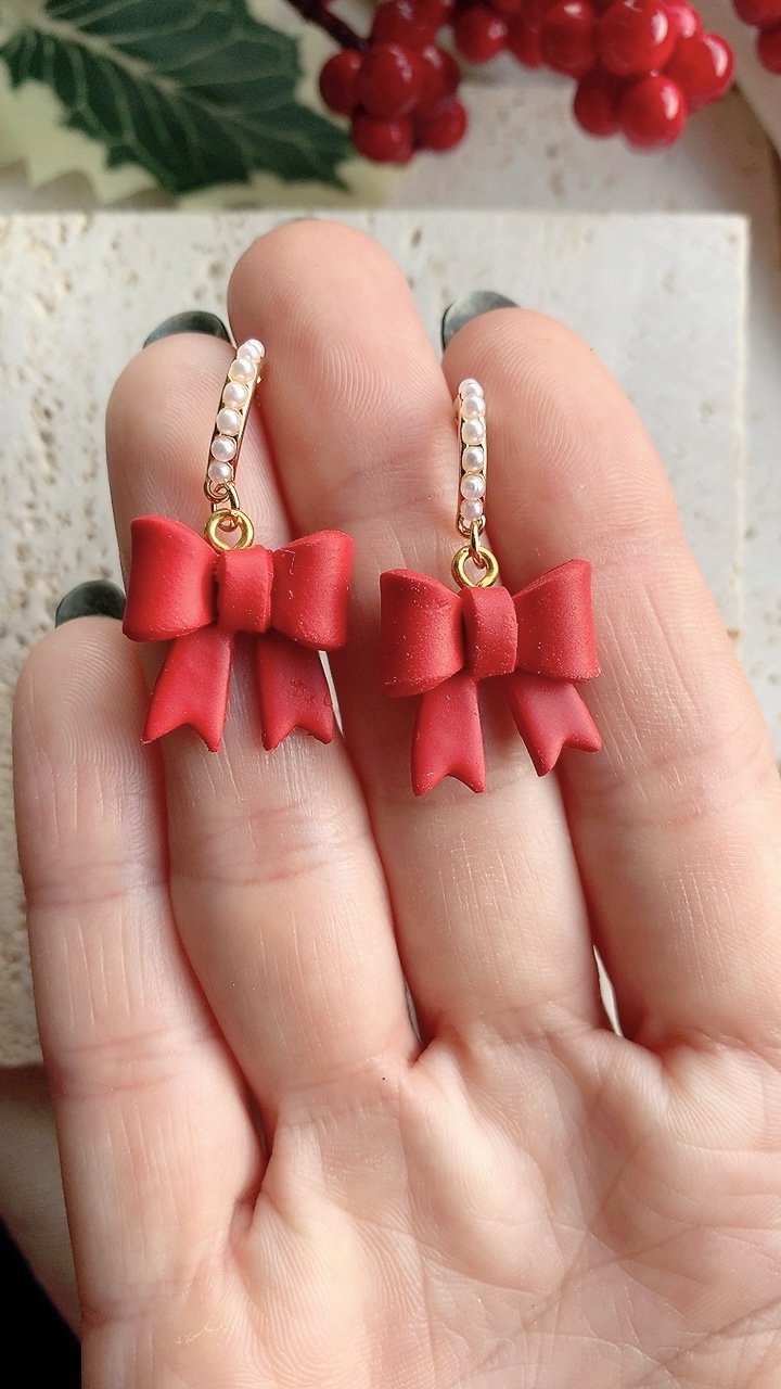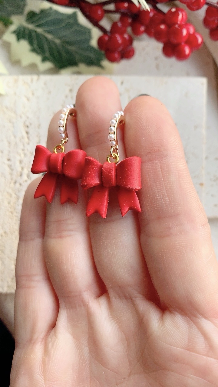 Gorgeous dainty red bow earrings finished with imitation pearl tops which are 18k gold plated nickel free. Sensitive ears? Swap to stainless steel hooks or ball posts.