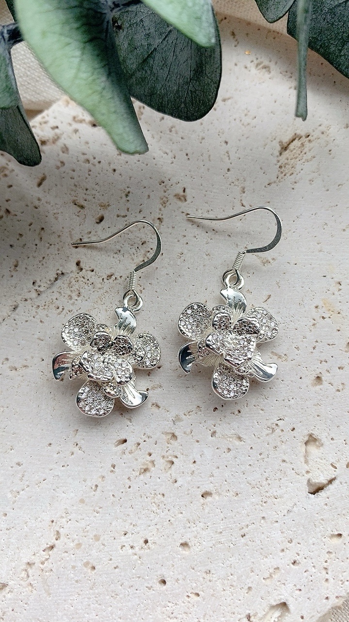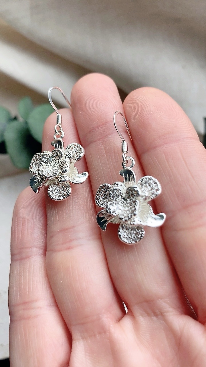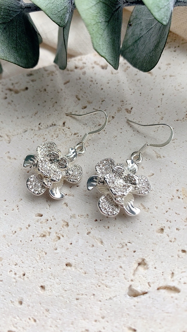 Beautiful silver flower charm earrings with 925 silver plated stainless steel hooks, hypoallergenic and suitable for sensitive ears. Flower charm is 925 silver plated nickel free cubic zirconia.