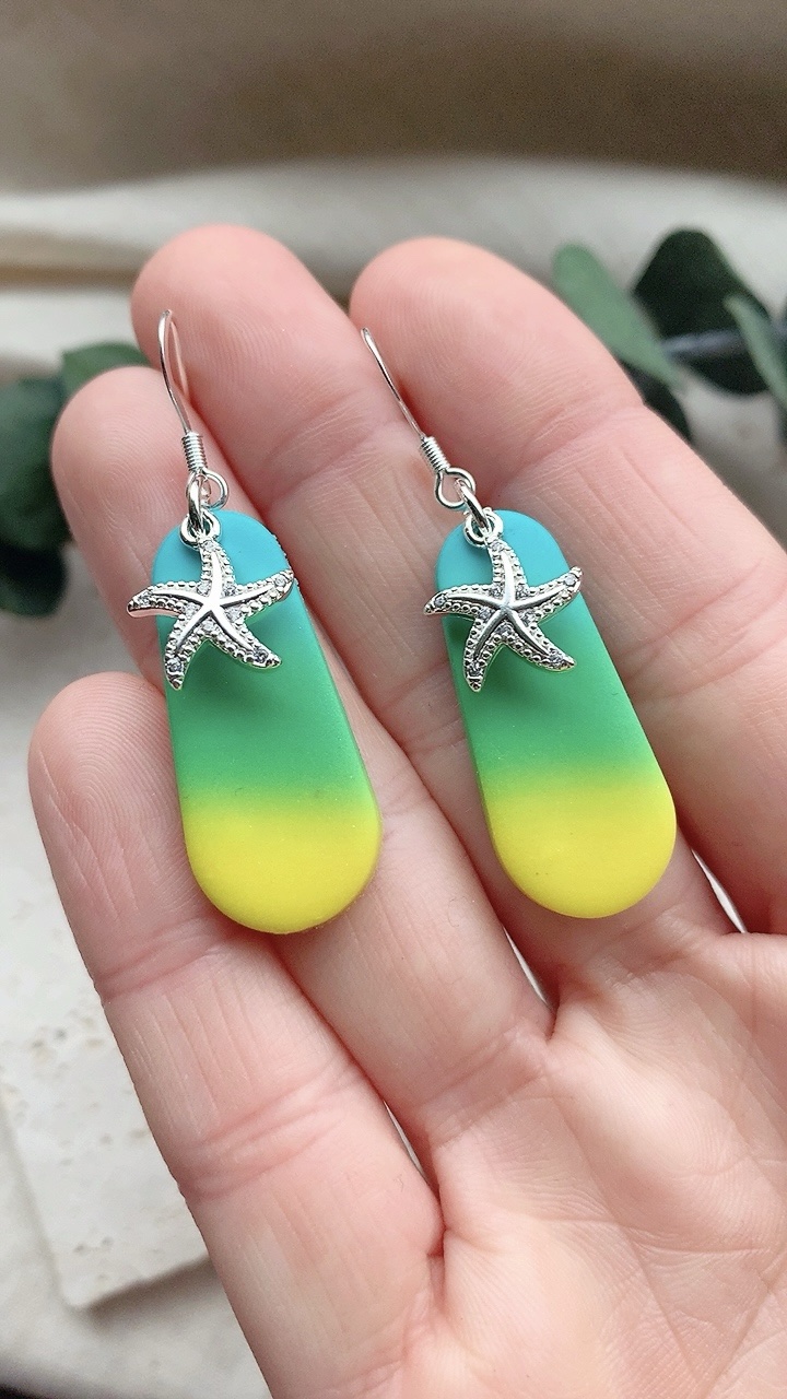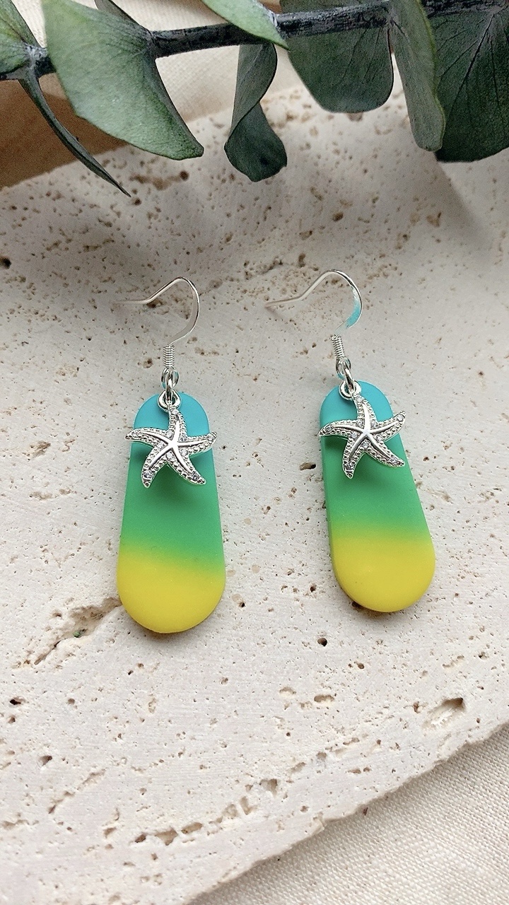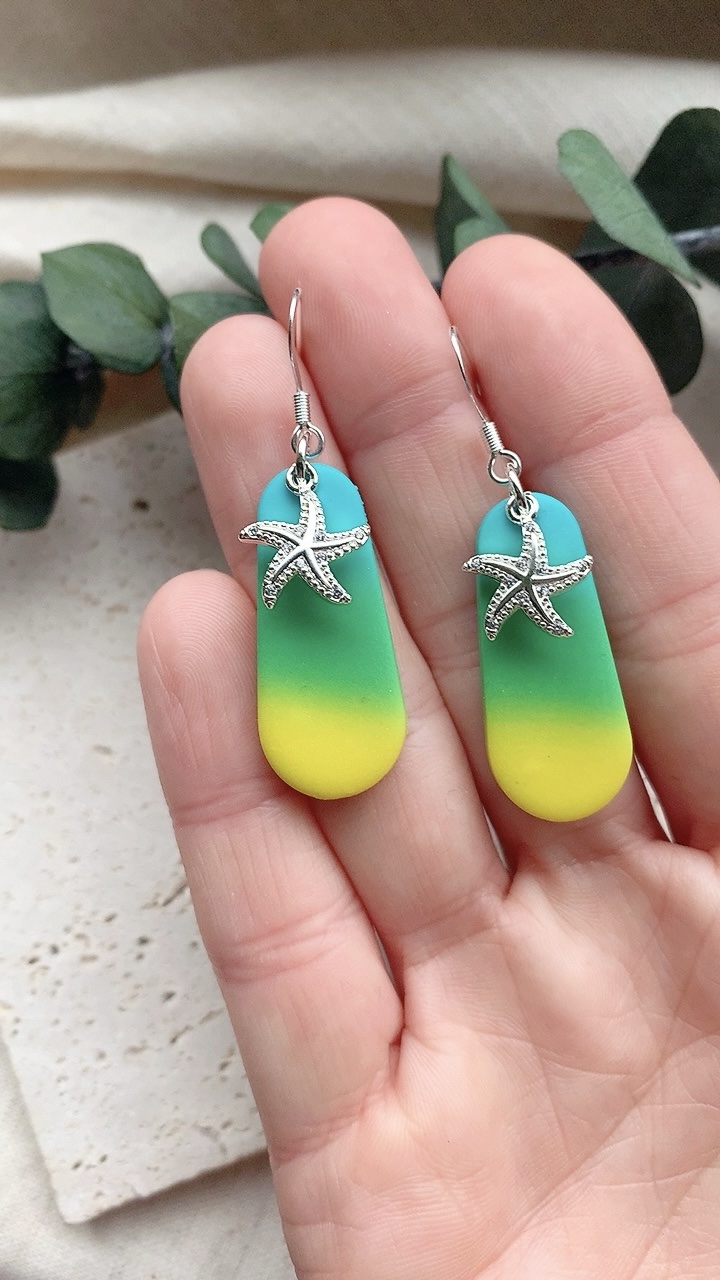 These earrings are carefully handcrafted using polymer clay and a starfish charm.  Very lightweight and comfortable to wear. Choose from stainless steel hooks/ballposts.