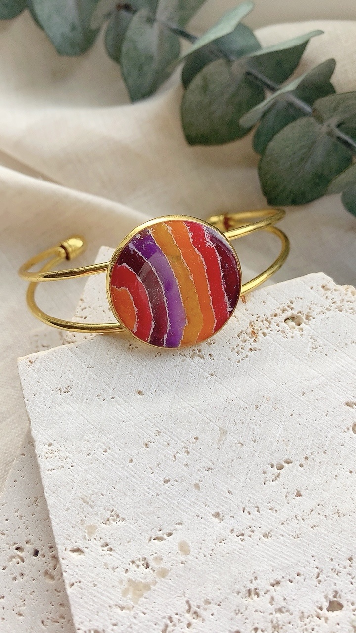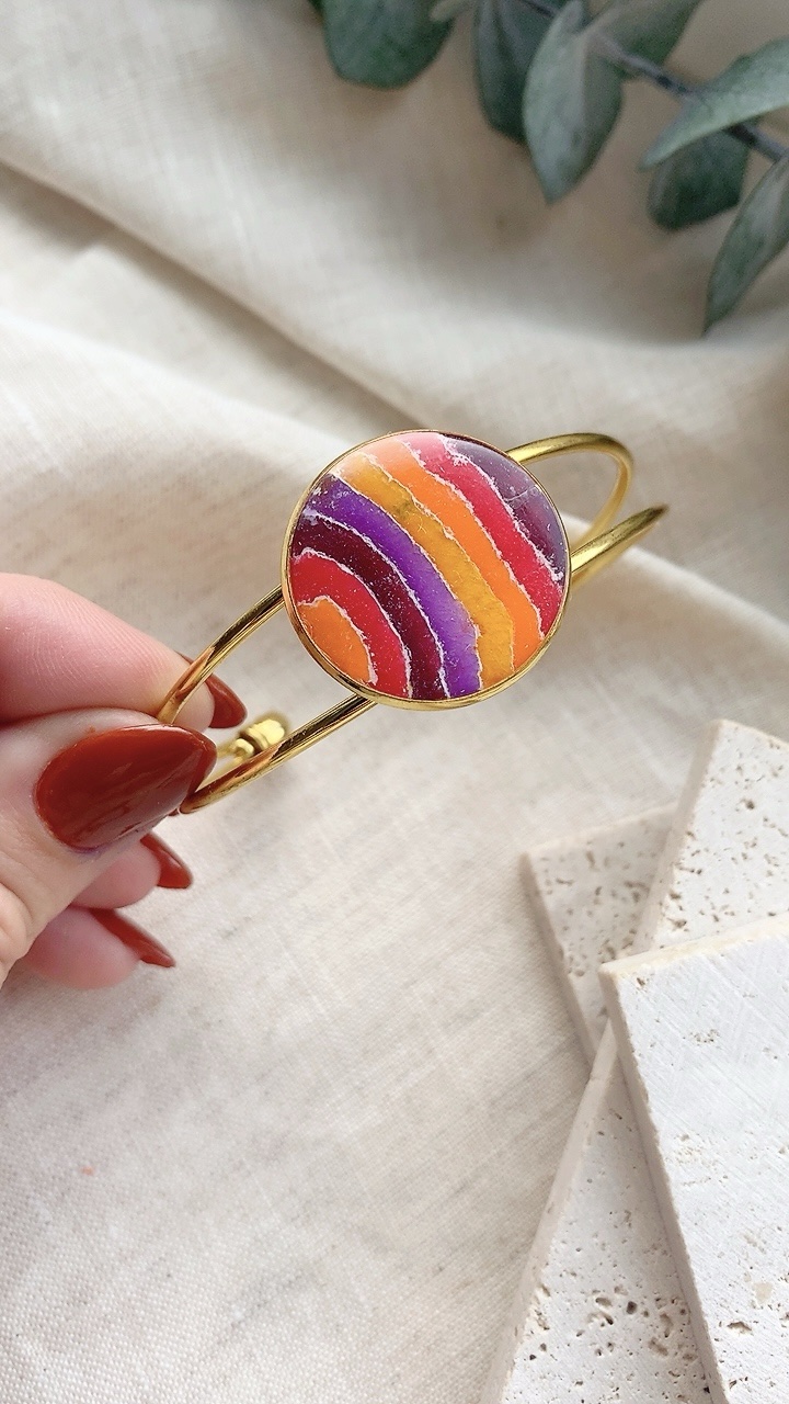 This bangle is carefully handcrafted using polymer clay. Embedded on an adjustable bangle. Very lightweight and comfortable to wear. 25mm Circle.