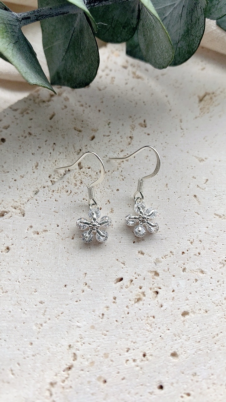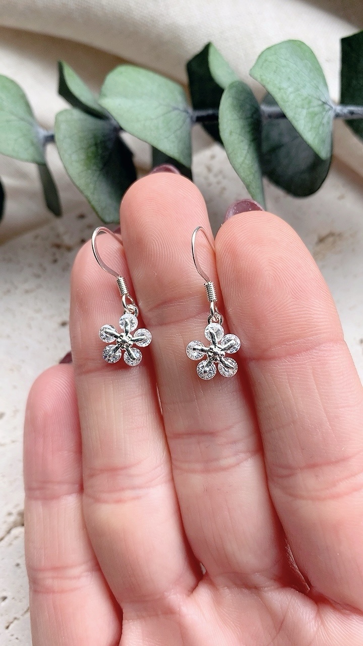 Beautiful silver flower charm earrings with 925 silver plated stainless steel hooks, hypoallergenic and suitable for sensitive ears. Flower charm is 925 silver plated nickel free cubic zirconia.